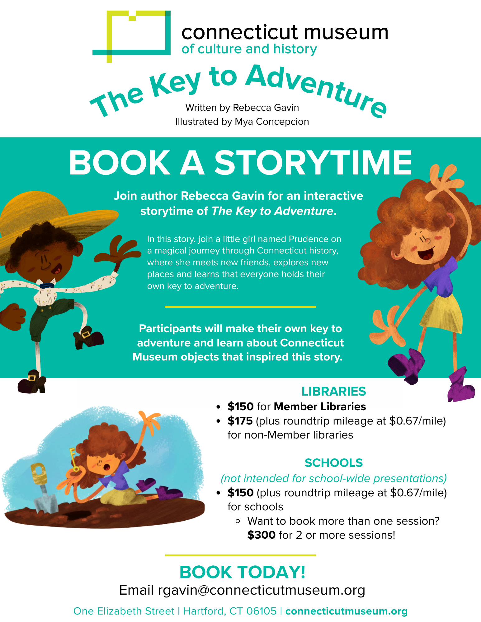 When a young girl named Prudence finds a strange-looking key, she brings it along on her visit to the Connecticut Museum–and suddenly falls back in time! Join Prudence on a magical journey through Connecticut history, where she meets new friends, explores new places, and learns that everyone holds their own key to adventure. With whimsical illustrations of the Connecticut Museum and its objects and a story that inspires imagination and encourages discovery, The Key to Adventure will delight children of all ages. Written and illustrated by Education staff members of the Connecticut Museum!